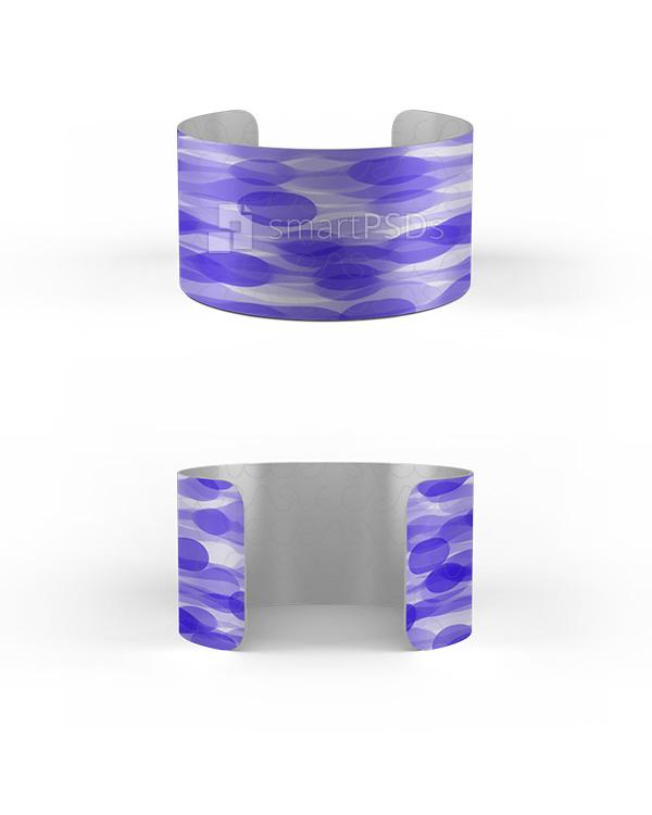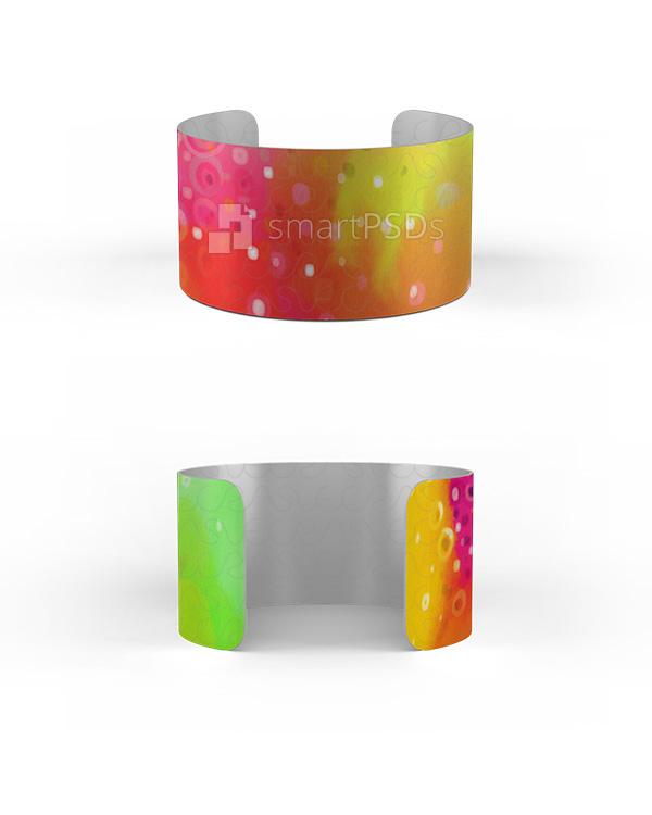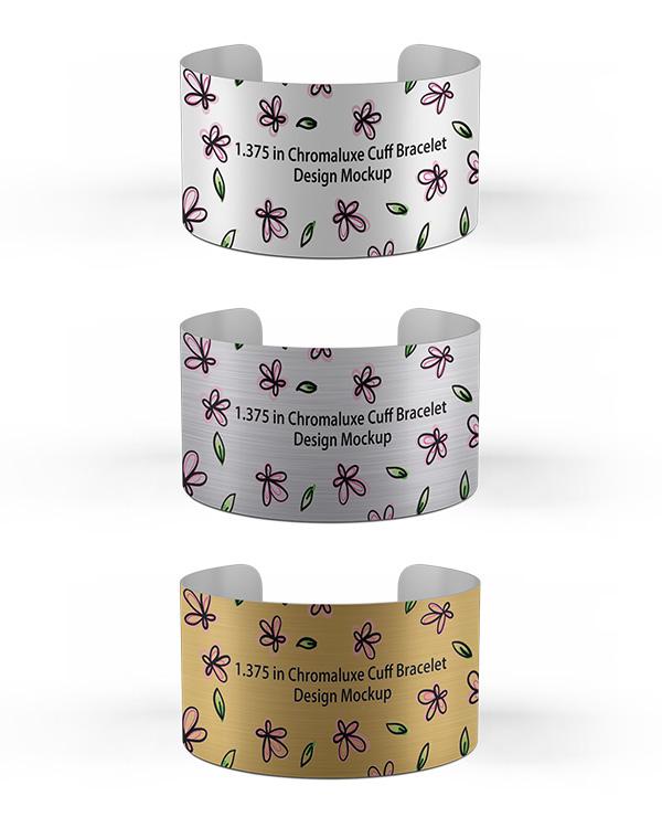 Smart PSD mockup file to make a preview design of 1.375 in chromaluxe cuff bracelet with rounded corners. Mockup showing two views front and back with ability to change the bracelet material look silver, gold or white.